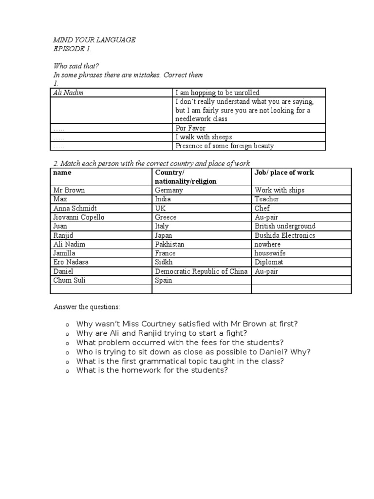 Mind Your Language Episode 1 Esl Worksheet By Amparias