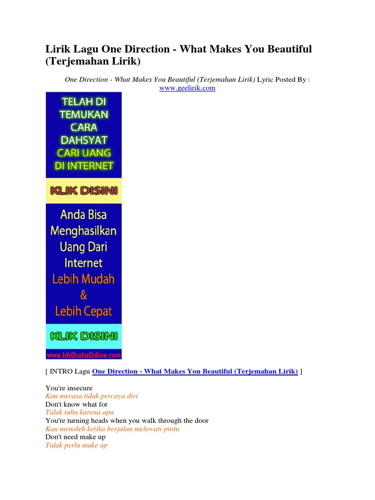 One Direction What Makes You Beautiful Lyrics Terjemahan