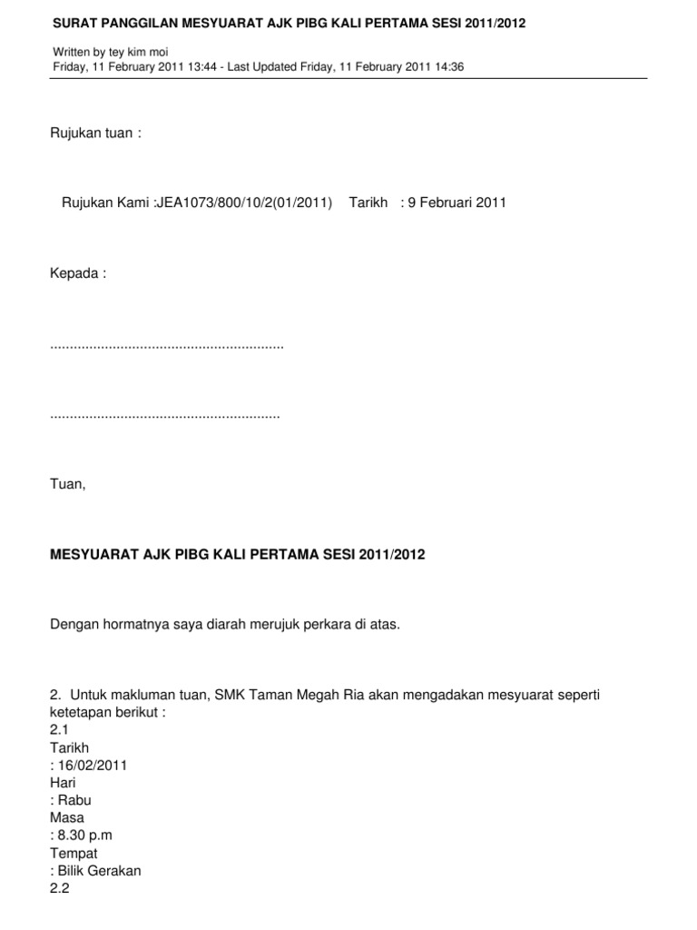 Contoh Surat Panggilan Mesyuarat Ajk Pibg Backup Gambar