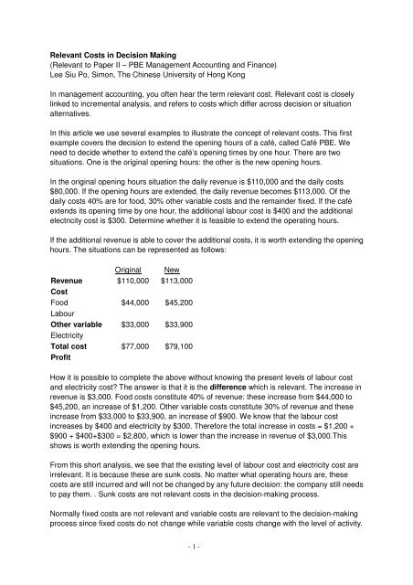 Relevant Costs In Decision Making Relevant To Paper Ii A Pbe