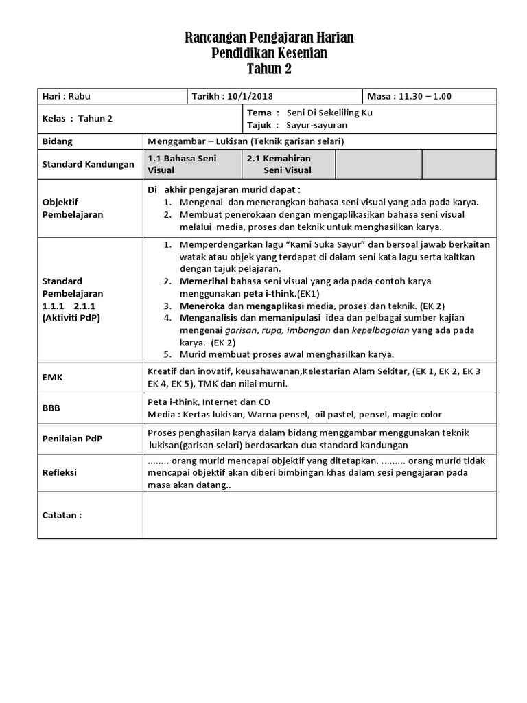 Rancangan Pengajaran Harian Pendidikan Kesenian Tahun 2