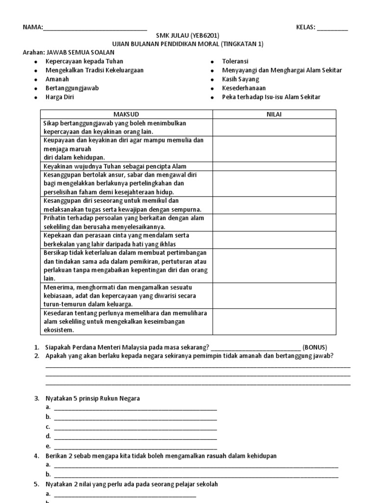 Soalan Pendidikan Moral Tingkatan 1 Morals