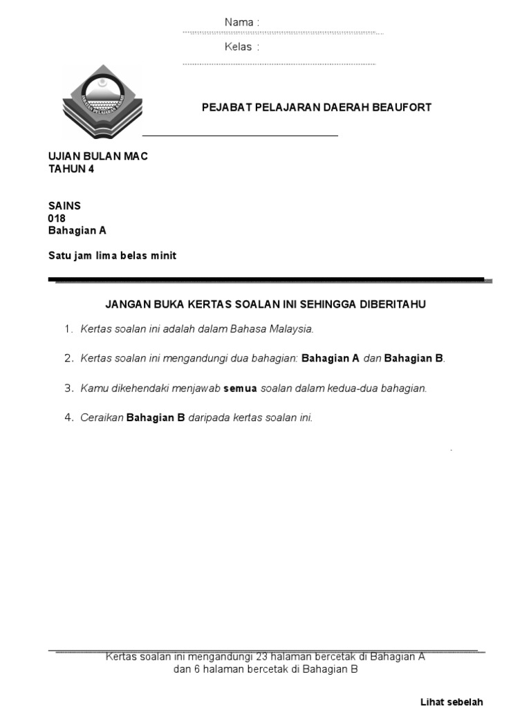Soalan Ujian Sains Tahun 4 Bulan Mac