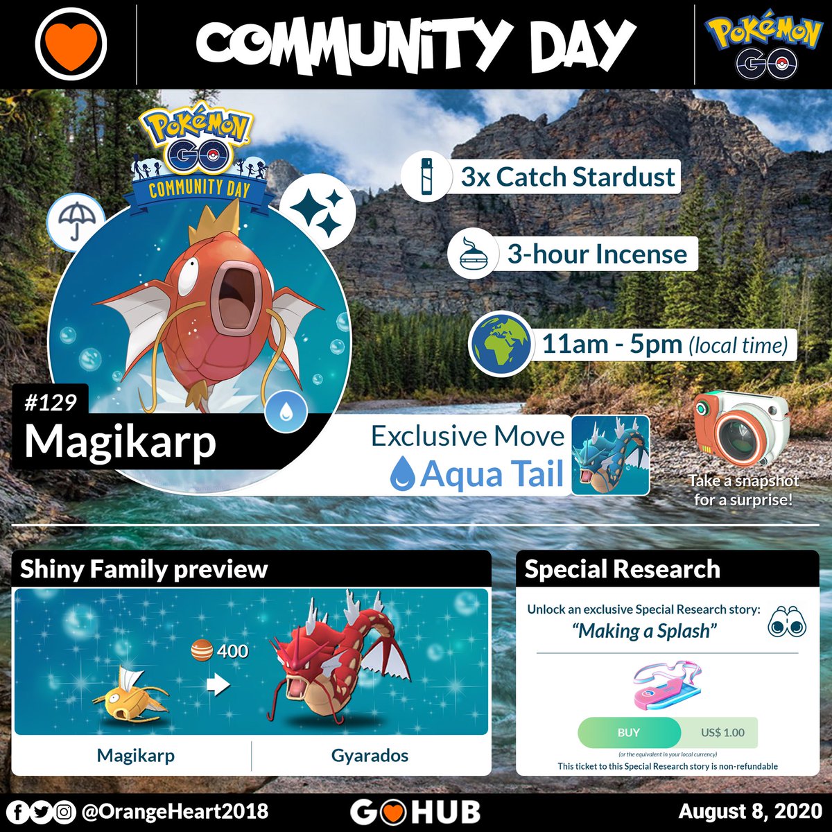 Orange Heart On Twitter Magikarp Community Day Will Happen On August 8th There Will Also Be A Community Day Exclusive Special Research For Sale Pokemon Pokemongo Pokemoncommunity Pokemongocommunityday Seedot Shinypokemon Teamvalor