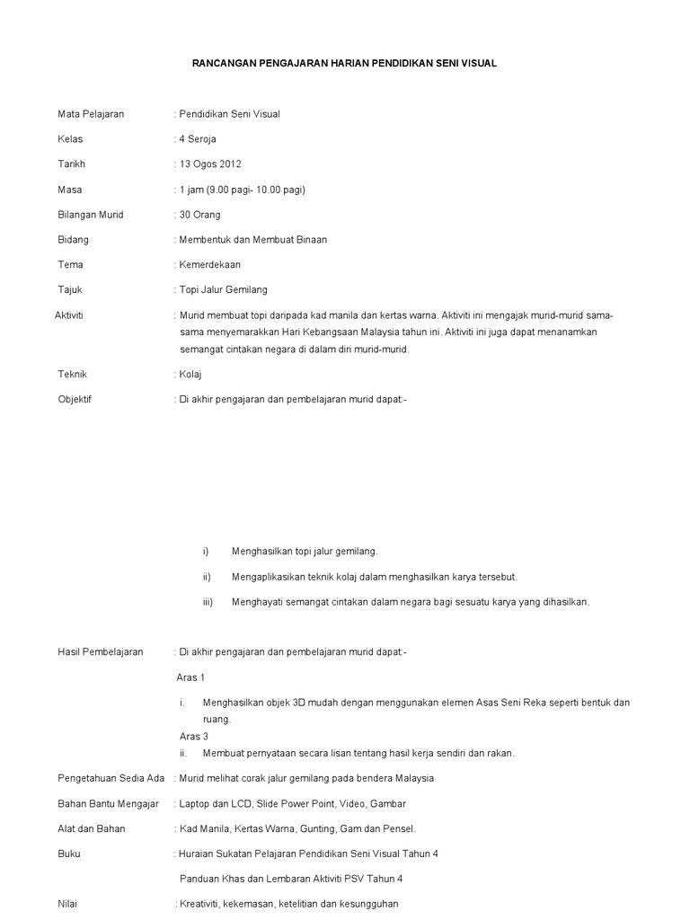 Rancangan Pengajaran Harian Pendidikan Seni Visual Topi Jalur Gemilang