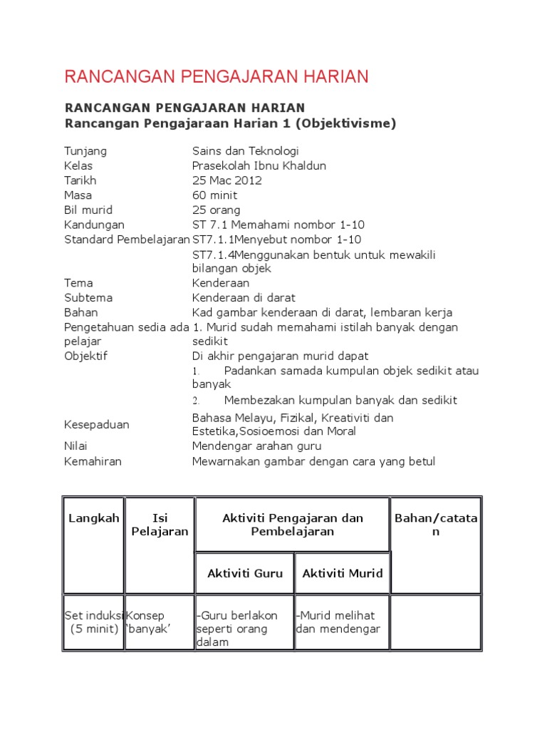 Rancangan Pengajaran Harian Docx Document